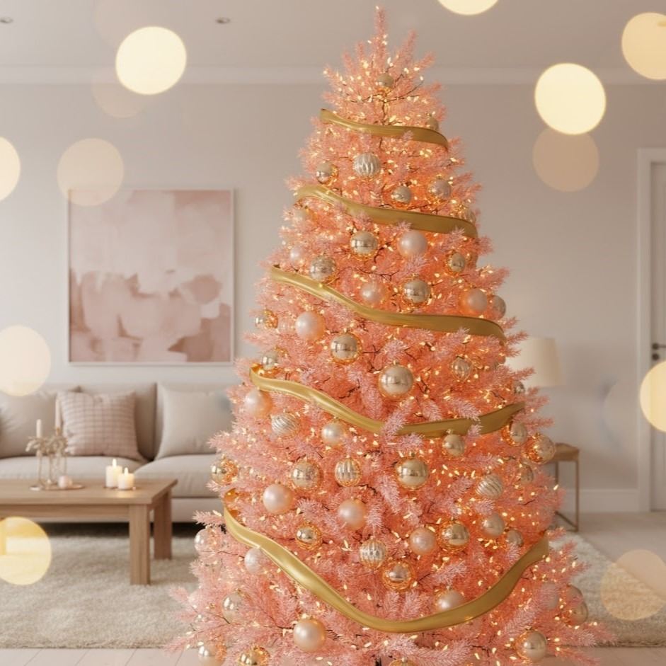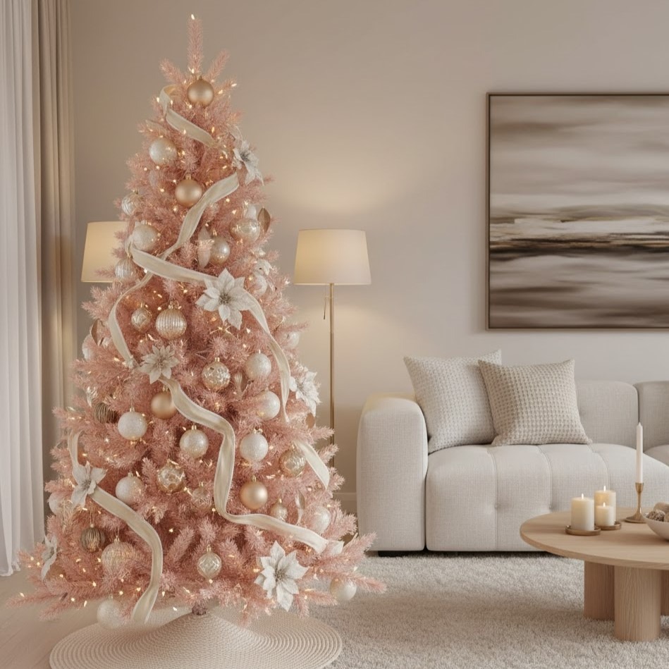 Stick to a soft blush or dusty pink tree and use neutral accents like white, beige, or champagne. Add simple ornaments in matte finishes and avoid excessive glitter to maintain a calm, balanced aesthetic.