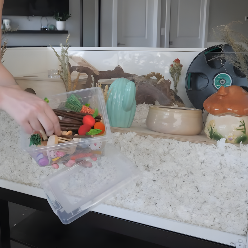 Adding deep bedding is one of the most important parts of preparing a hamster enclosure. It supports natural burrowing behaviour, helps stabilize tunnels, and absorbs odors effectively. A properly layered bedding base creates a secure, comfortable underground environment where your hamster can dig, nest, and rest naturally.