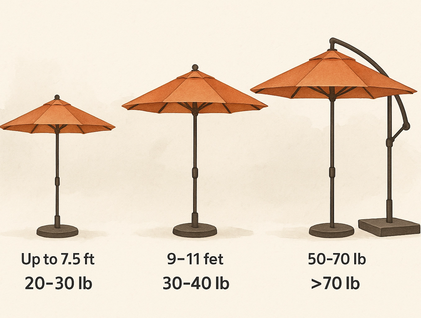 - 9 to 11 feet: For larger umbrellas, a 50-70 pound base is recommended.
