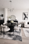 A round table, soft chairs, and warm light create an inviting spot for meals and conversations, where simple details turn daily dining into a calm, comforting ritual.
