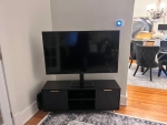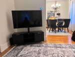 This sleek living space features a monochrome palette with charcoal-toned drawer units and a large wall-mounted TV. Accented by greenery, framed art, and soft lighting, the room strikes a balance between modern function and cozy ambiance.