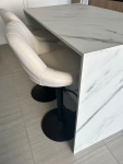 Easy to assemble, comfortable, and a perfect match for my kitchen island. The fabric is soft and comfortable, but it can get dirty easily, so it requires a bit of care.