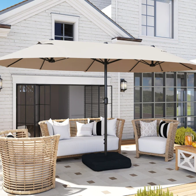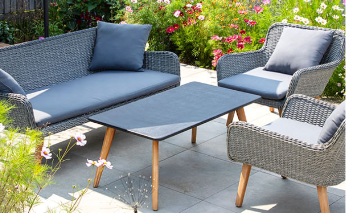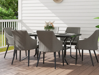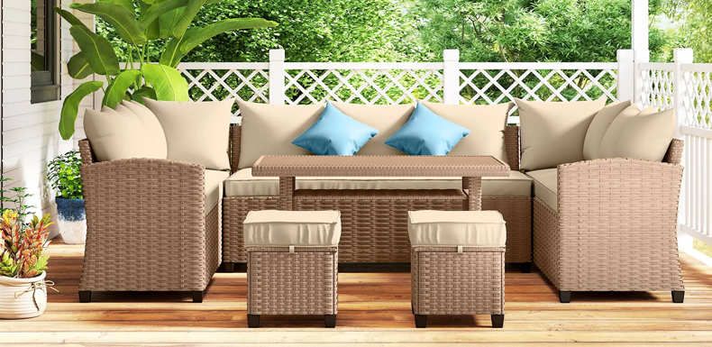 Transform your outdoor space into a cozy retreat with a rattan sofa made of easy-care plastic rattan. Add a stylish sunshade and a charming patio dining set for the ultimate relaxation and dining experience.