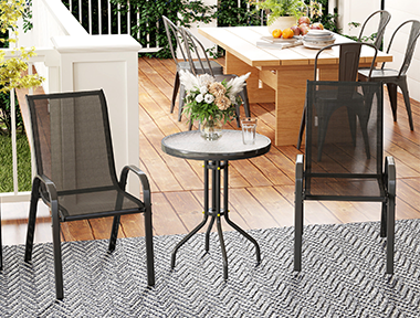 Embrace laid-back afternoons in this chic outdoor setup. The rattan seating and patterned rug bring comfort and style to your garden retreat — perfect for coffee breaks or casual chats.