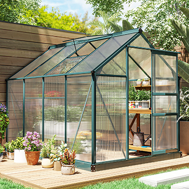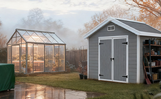 Keep planting with the greenhouse, store tools neatly in the cabinet, and protect your garden furniture with covers — cosy, organised, and ready for autumn days.