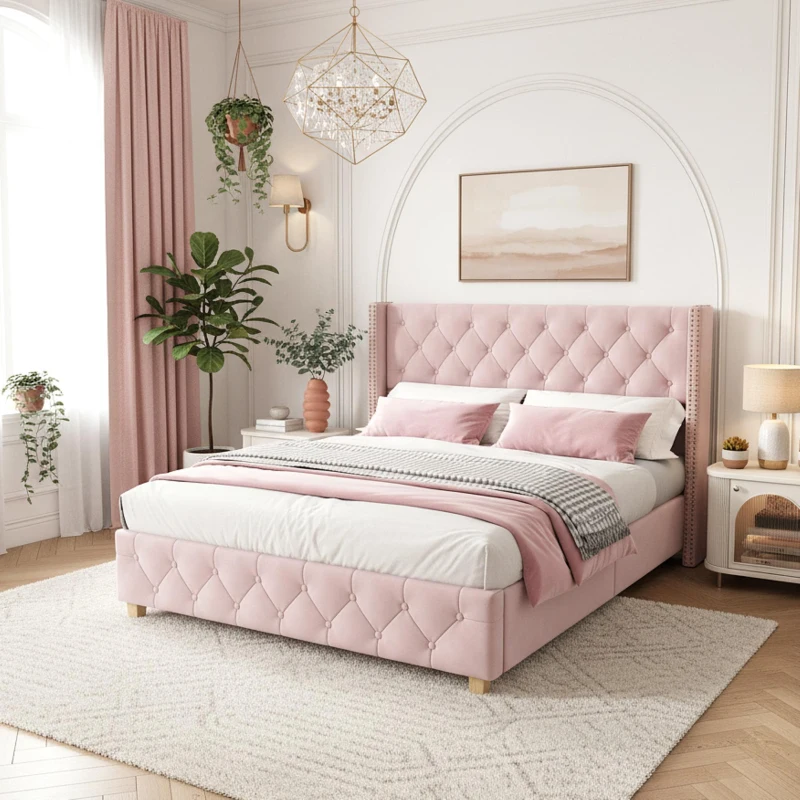 Full Size Velvet Upholstered Platform Bed with Diamond Button Tufting, Extra‑Wide Bedboard with Wooden Legs, 58.5'' L x 78'' W x 42.5'' H, Pink