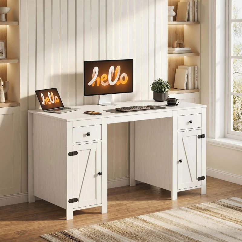 HOMCOM 53" Farmhouse Executive Desk, Computer Desk with Drawers and 2 Cabinets, Study Table for Home Office, White Wood Grain