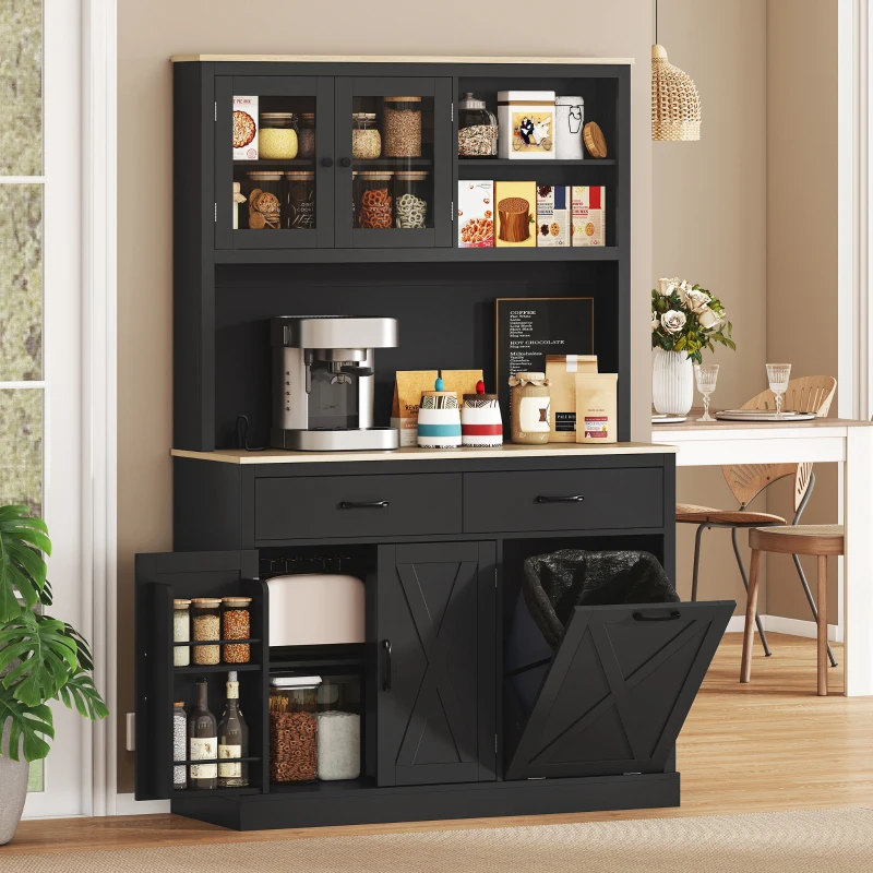 HOMCOM 69" Pantry Cabinet with Charging Station, Kitchen Storage Cabinet with Microwave Stand, Tilt-Out Trash Can, Black