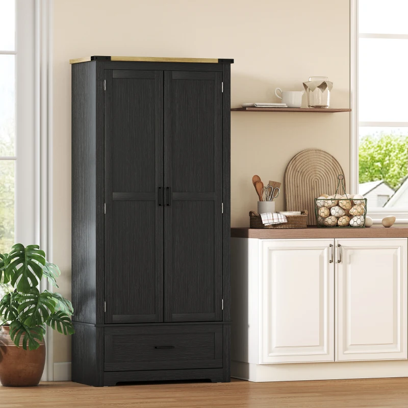 HOMCOM 69" Tall Farmhouse Kitchen Pantry Cabinet with 2 Doors, Drawer and Adjustable Shelves, Black and Brown