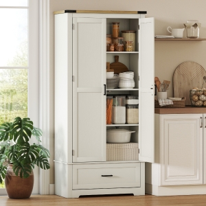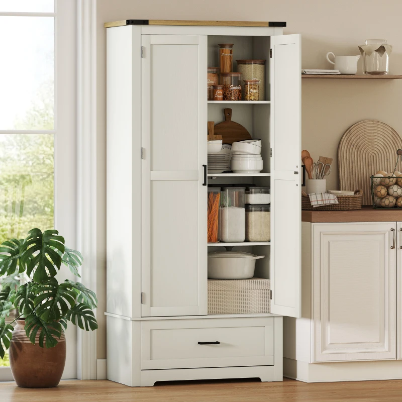 HOMCOM 69" Tall Farmhouse Kitchen Pantry Cabinet with 2 Doors, Drawer and Adjustable Shelves, Cream White