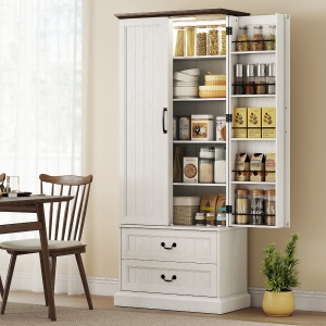 • Kitchen Pantry Storage Cabinet Info: Dimensions: 30.1" W x 15.7" D x 71.3" H (76.5 x 40 x 181 cm). Weight capacity: 282 lbs/128 kg (total). Assembly required