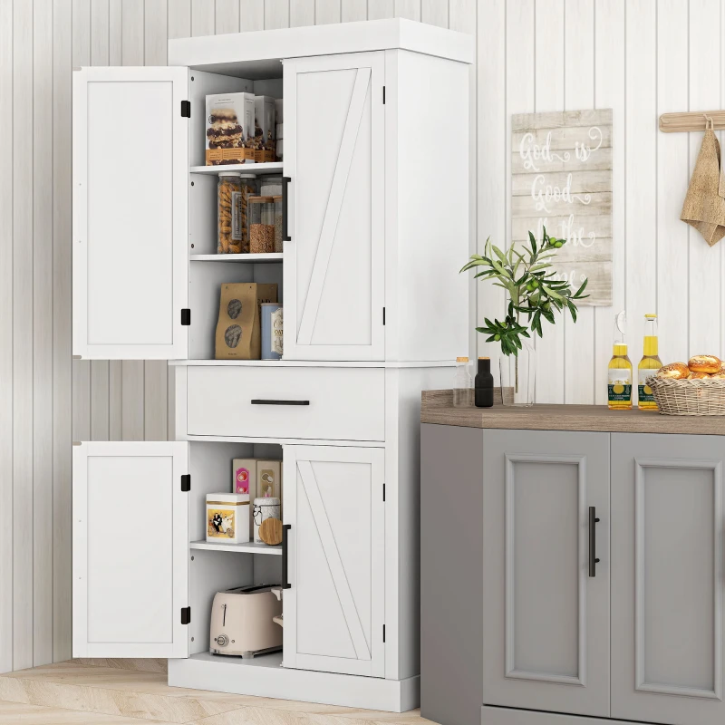 HOMCOM 72" Kitchen Storage Cabinet, Farmhouse Kitchen Pantry Cabinet with 4 Barn Doors, Drawer, Adjustable Shelves, White