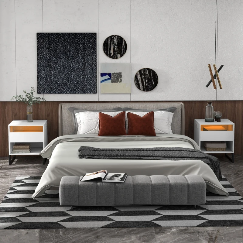 HOMCOM Bedside Table Set of 2, Side End Tables with Charging Station and USB Ports, LED Lights, 19" x 17" x 22", White