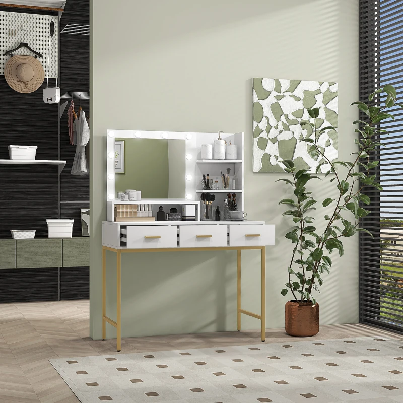 HOMCOM Illuminated Dressing Table, LED Vanity Table with Mirror, 3 Drawers and Storage Shelves for Bedroom, White