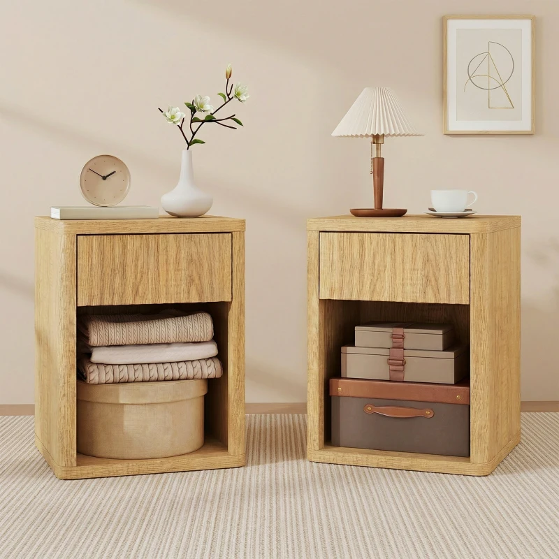 HOMCOM Nightstand with Drawer and Open Shelf, Modern Bedside Table Set of 2 for Bedroom Living Room, Oak