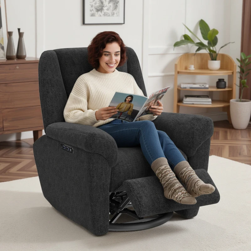 HOMCOM Power Recliner Chair, Fabric Upholstered Recliner Chair with USB Ports, Swivel and Rocking Function, Footrest, Black