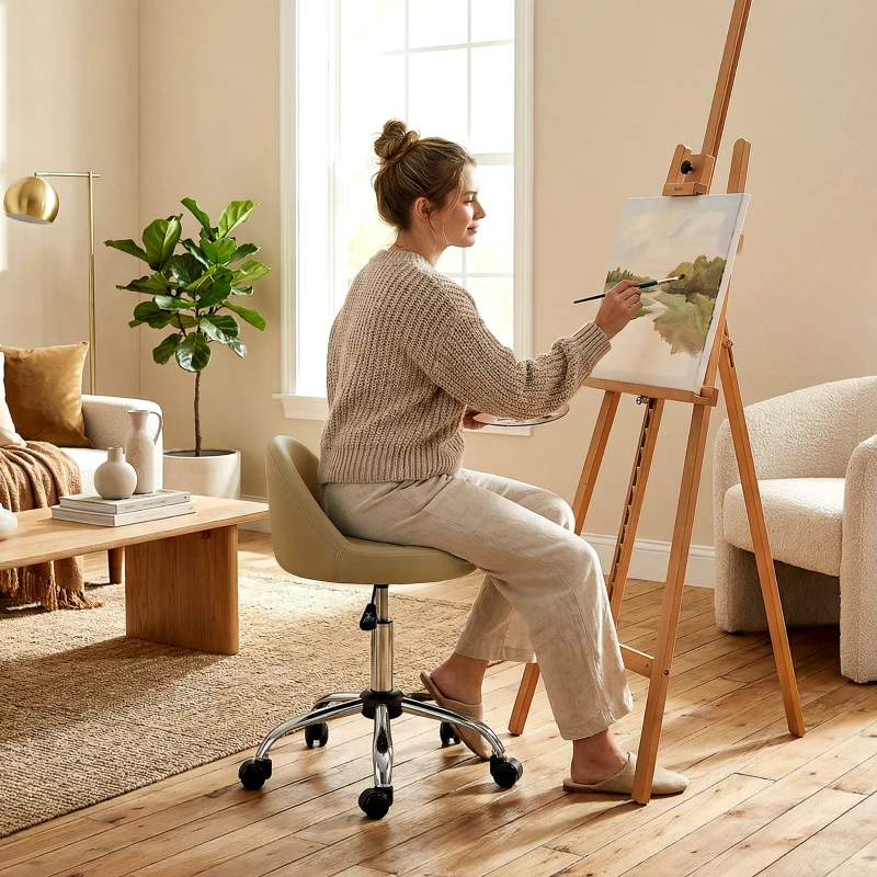 HOMCOM Salon Stool, Adjustable Rolling Stool, Light Brown