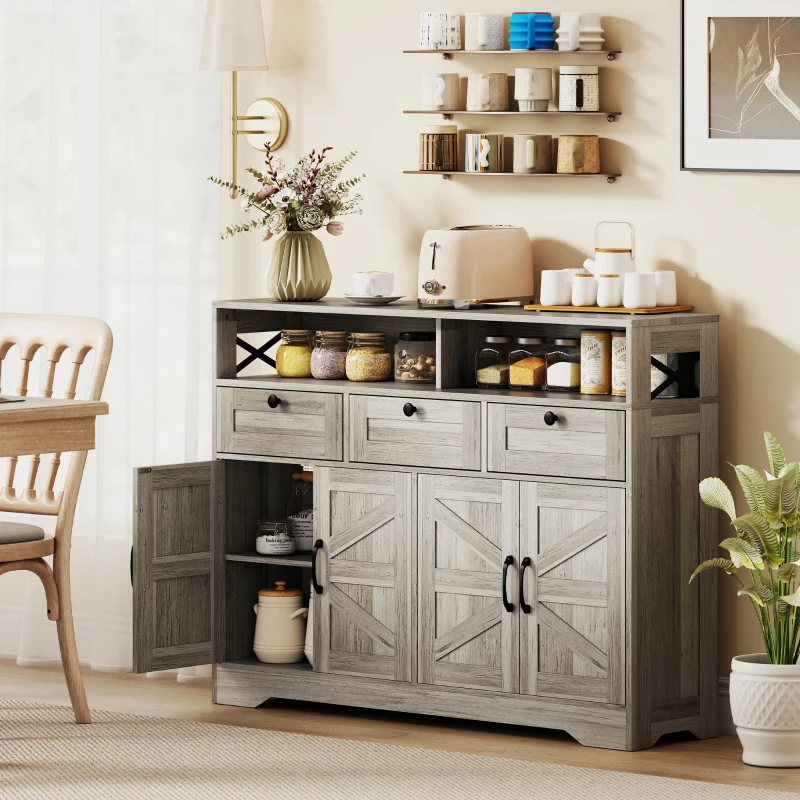 HOMCOM Sideboard, Buffet Cabinet with 4 Barn Doors and 3 Drawers, Coffee Bar Cabinet with Adjustable Shelves, Grey