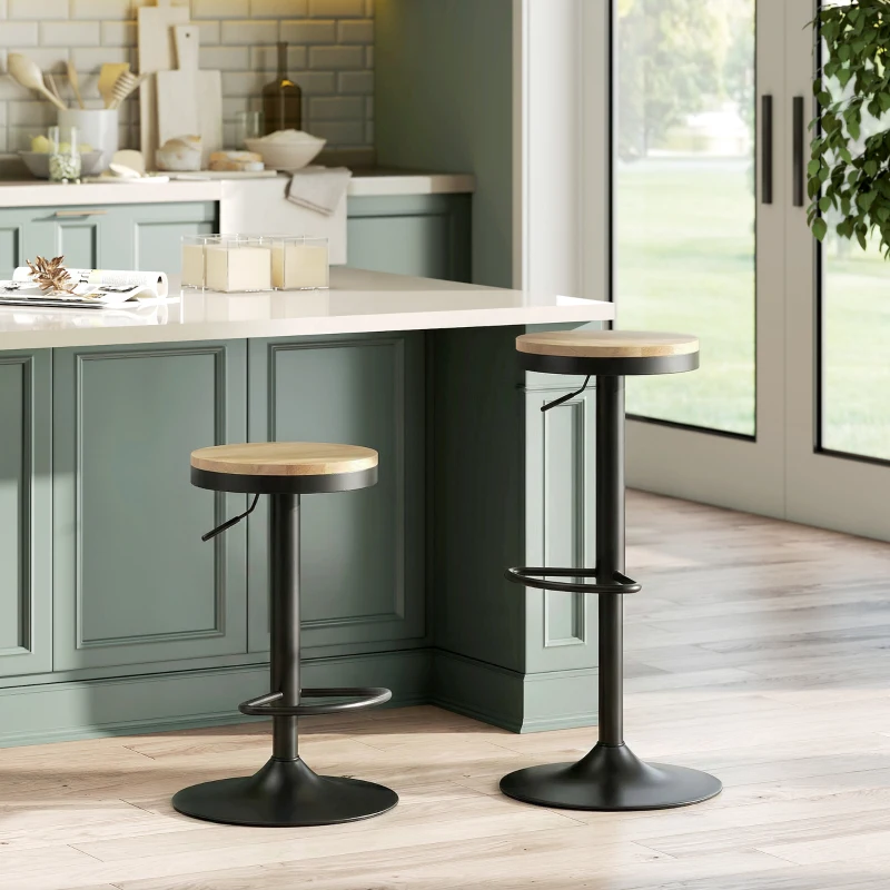 HOMCOM Wood Barstools Set of 2, Swivel Bar Stools with Adjustable Height for Kitchen Counter, Natural Wood and Black