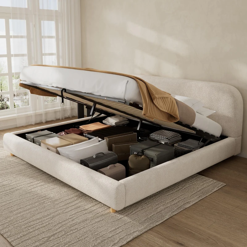 King Size Hydraulic Lift Storage Bed with Upholstered Curved Headboard, Hidden Under-Bed Storage for Bedroom, 86'' L x 80'' W x 35'' H, White