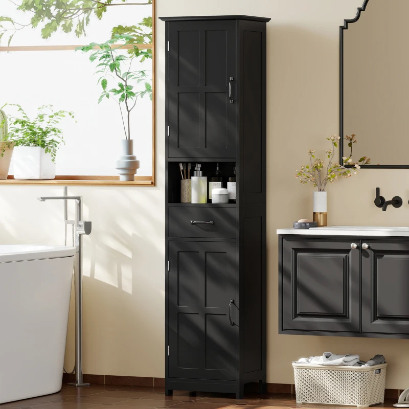 kleankin Modern Bathroom Cabinet, Narrow Bathroom Vanities with Open Shelf Drawer Recessed Doors and Adjustable Shelves Black