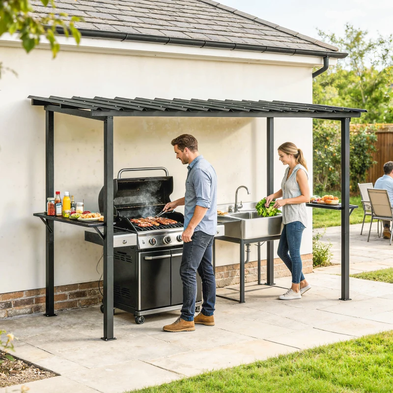 Outsunny 12' x 6' Hardtop Grill Gazebo, BBQ Gazebo with 2 Side Shelves and Galvanized Metal Slope Roof, Black