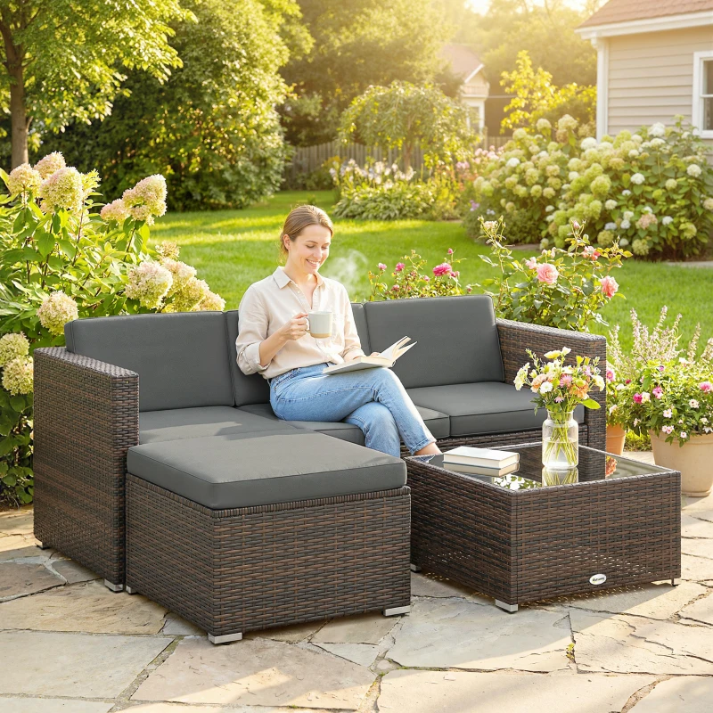 Outsunny 3 Pieces Patio Furniture Set with Cushions, Outdoor PE Rattan Wicker Conversation Corner Sofa Set, Dark Grey