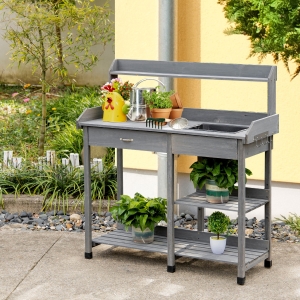 Outsunny Garden Potting Bench, Outdoor Wooden Workstation Table w/ Metal Screen, Drawer, Hooks, Storage Shelf, and Lattice Back for Patio, Backyard and Porch