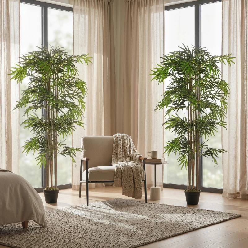 Outsunny 6FT Artificial Bamboo Tree Set of 2, Fake Plant with 1530 Leaves, Greenery Plant in Nursery Pot for Indoor, Green