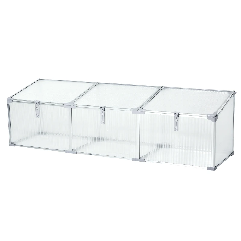 Go green with our Outsunny 51” aluminum framed greenhouse and grow anything you want, when you want, all throughout the year. Transparent polycarbonate panels allow maximum light transmission while retaining heat for early seed sprouting or for protecting plants late in the season. Adjustable roof openings provide proper ventilation and easy access to your plants. The cover panels can be opened just a few inches to create a flat top surface or opened completely to allow full access to the inside. The lightweight aluminum frame and rust-resistant hardware helps prevent corrosion from affecting all of the components of your cold frame greenhouse, making it last for many seasons to come.