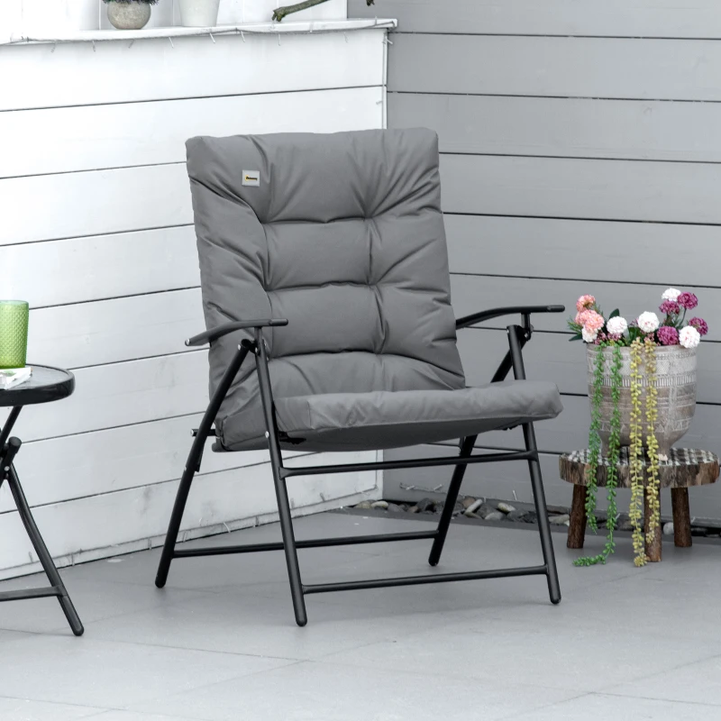 Outsunny Foldable Lounge Chair, Fabric Upholstered Recliner, Outdoor Lounger with Armrest, Metal Frame for Backyard, Grey