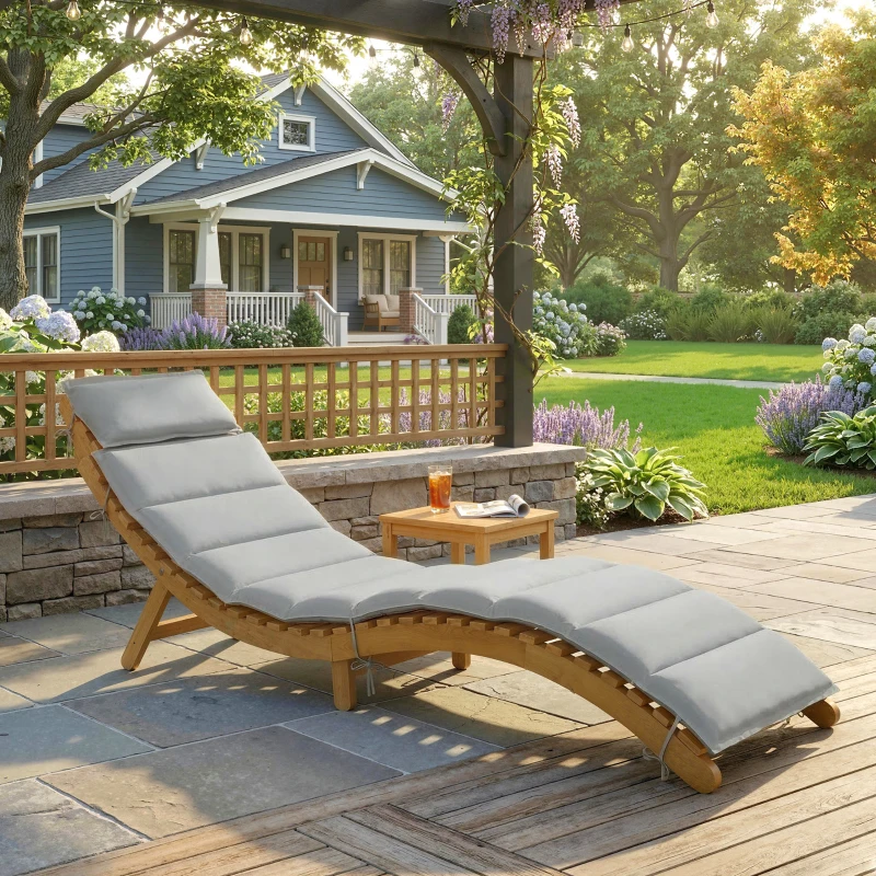Outsunny Folding Chaise Lounge Chair Outdoor, Acacia Wood Lounger Tanning Chair with Cushion, Headrest, Light Grey