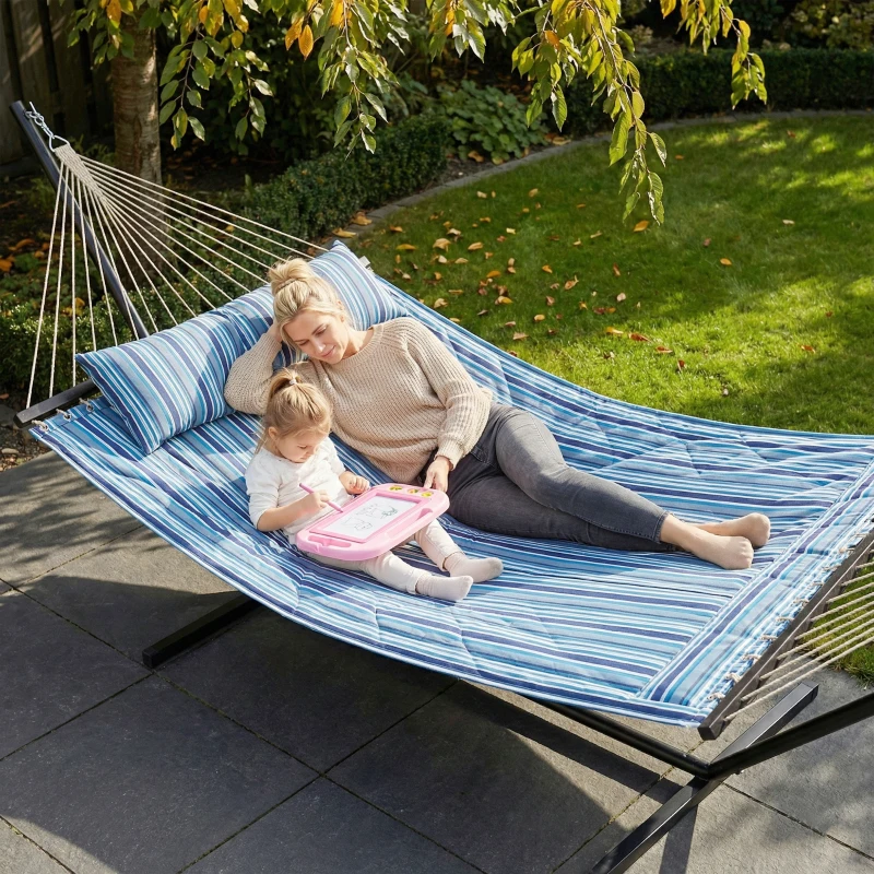 Outsunny Hammock with Stand Heavy Duty Camping Hammock with Steel Frame for Patio Backyard Blue and White