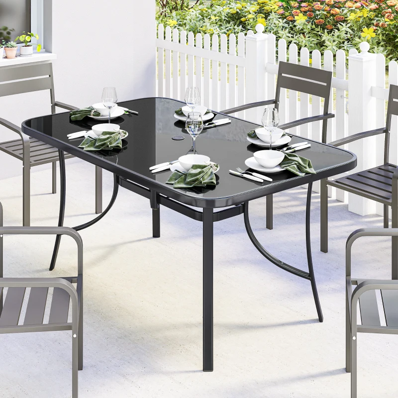 Outsunny Outdoor Dining Table for 6 with Umbrella Hole, Metal Patio Dining Table with Tempered Glass Top