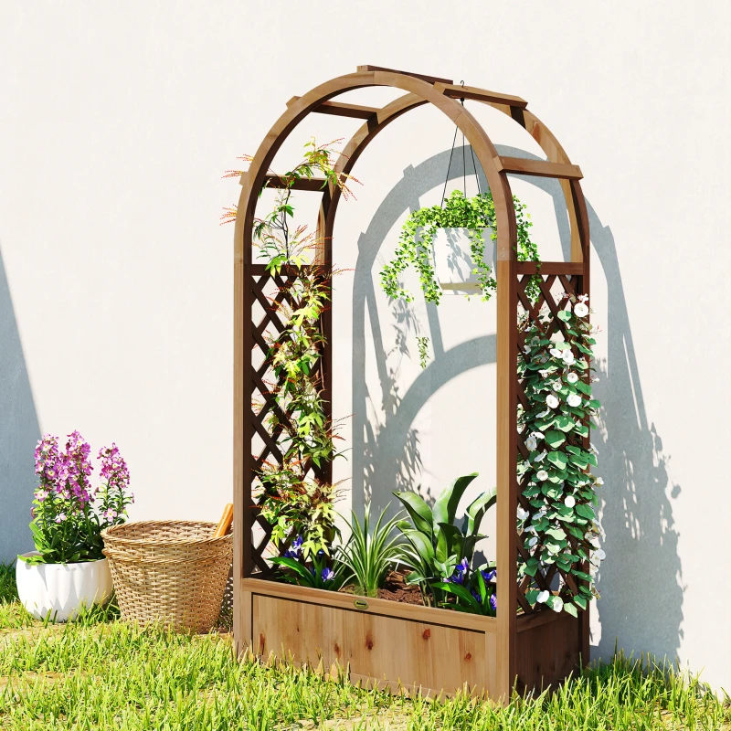 • Decorative Planter: This wooden planter box with a top arch and side lattices supports climbing plants and flowers. Decorate it with balloons, lights, or other accents to create a striking centrepiece for parties and special occasions.