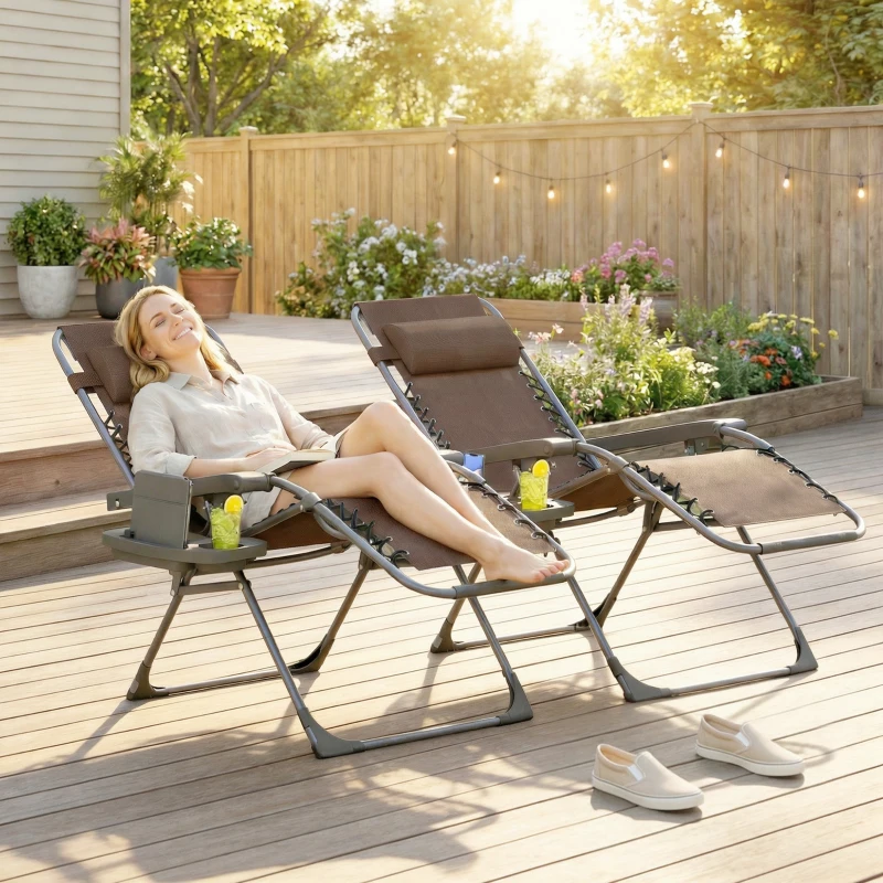 Outsunny Zero Gravity Chair Set of 2, Folding Reclining Outdoor Lounge Chair with Cup Holder, Headrest, Brown