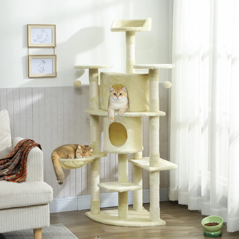 PawHut 62" Cat Tree with Scratching Post, 2 Condos, Hammock, Perches, Plush, Pompoms, for Indoor Cats, Beige