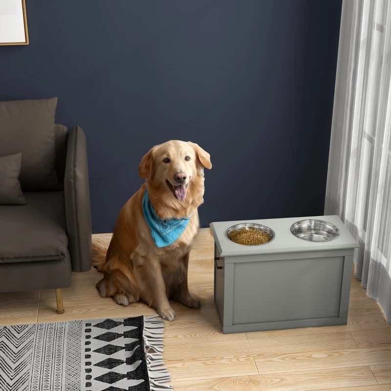 PawHut Elevated Dog Bowls for Large Dogs with Storage 2 Stainless Steel Dog Bowls, Elevated Base for Large Dogs, Grey