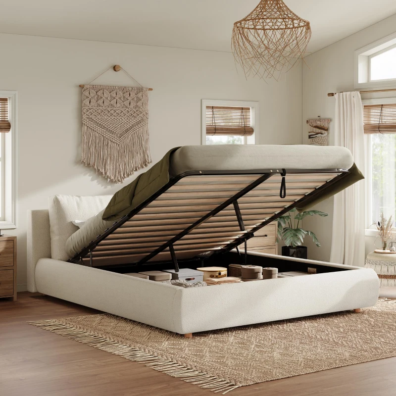 Queen Size Hydraulic Lift Storage Bed with Removable-Washable Headrests, Solid Bed Frame with Padded Cushions, 91'' L x 64'' W x 37'' H, White
