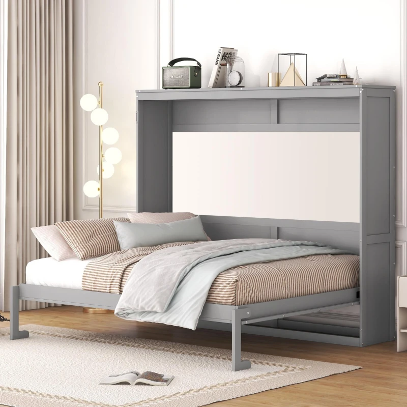 Queen Size Murphy Wall Bed with MDF & Plywood Construction, Fold-Away Cabinet Bed with Flexible Slat Support, 82'' L x 68'' W x 69'' H, Gray