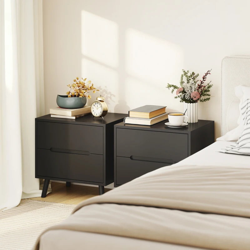 HOMCOM Nightstands Set of 2, Bedside Table with 2 Drawers, Modern Side End Table with Solid Wood Legs for Bedroom, Black