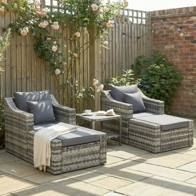 Outsunny 5-Piece Patio Furniture Set Outdoor Rattan Wicker Conversation Set with 2 Cushioned Chairs, 2 Ottomans and Coffee Table, Grey